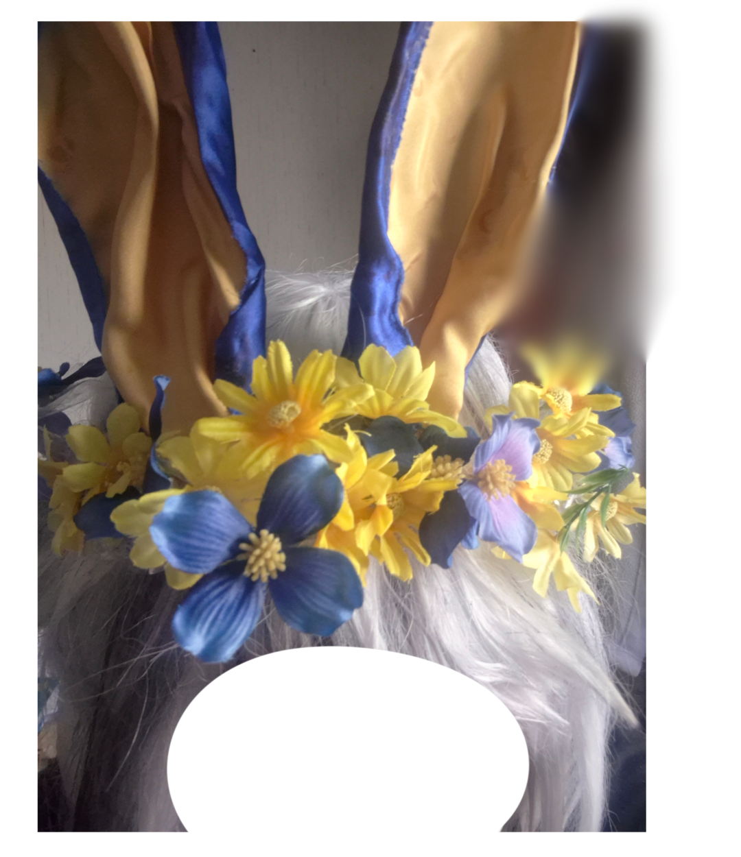 After this, I used an airbrush to add black streaks to it and styled it with Got2b spray, and fabric glue. I measured wire to fit the circumference of my head and then used tape and fake blue and yellow flowers to make a flower crown in place of her striped headband as I thought it would be cute. Unsurprisingly, there are issues with the flowers on the flower crown falling off because tape is not very secure, so I decided to pin them together as well. I made the ears with ABS plastic sheets, fabric glue, and royal blue + golden satin, following the tutorial embeded below.