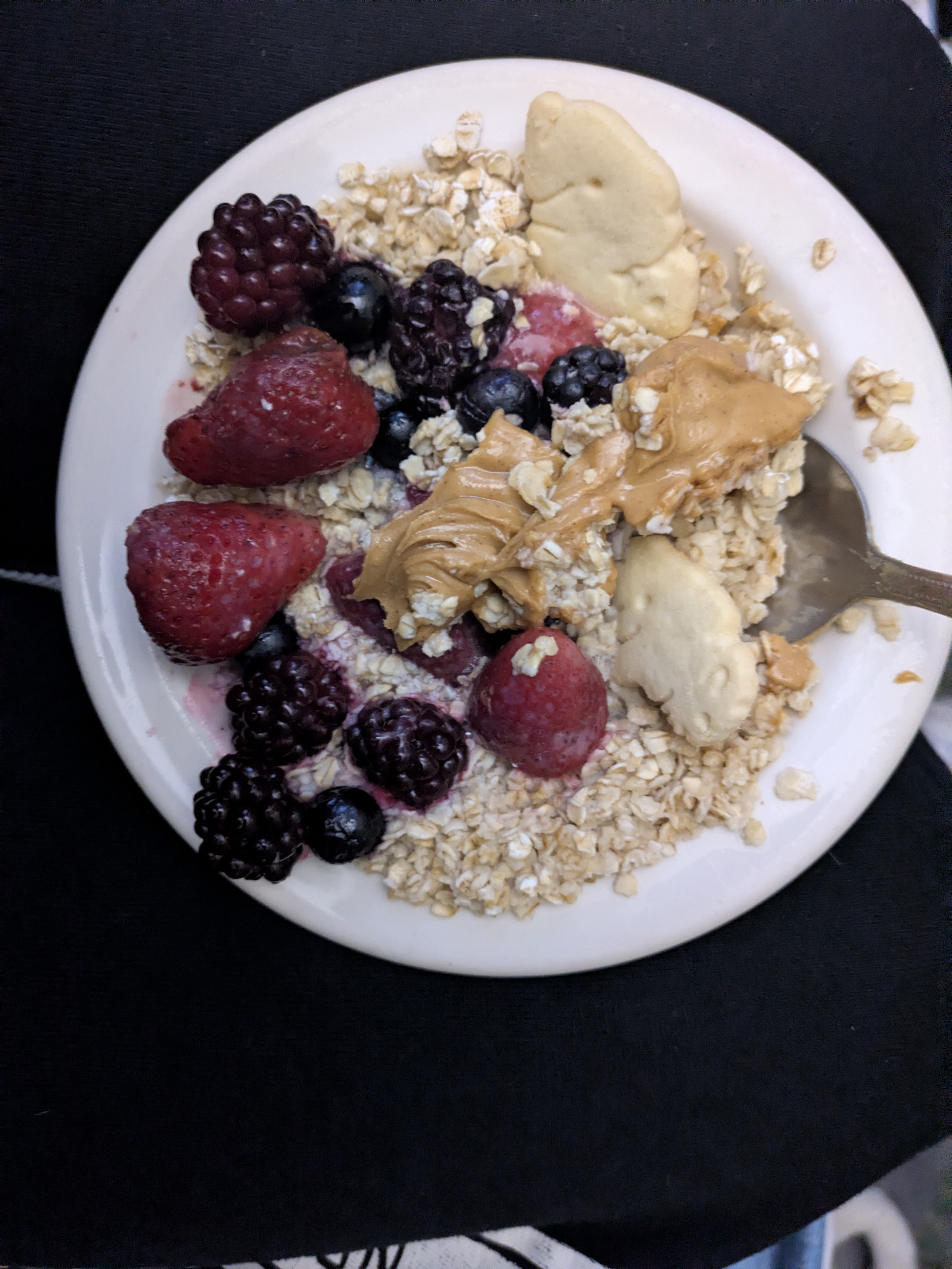Breakfast bowl - mixed berries, peanut butter, oatmeal, animal crackers.