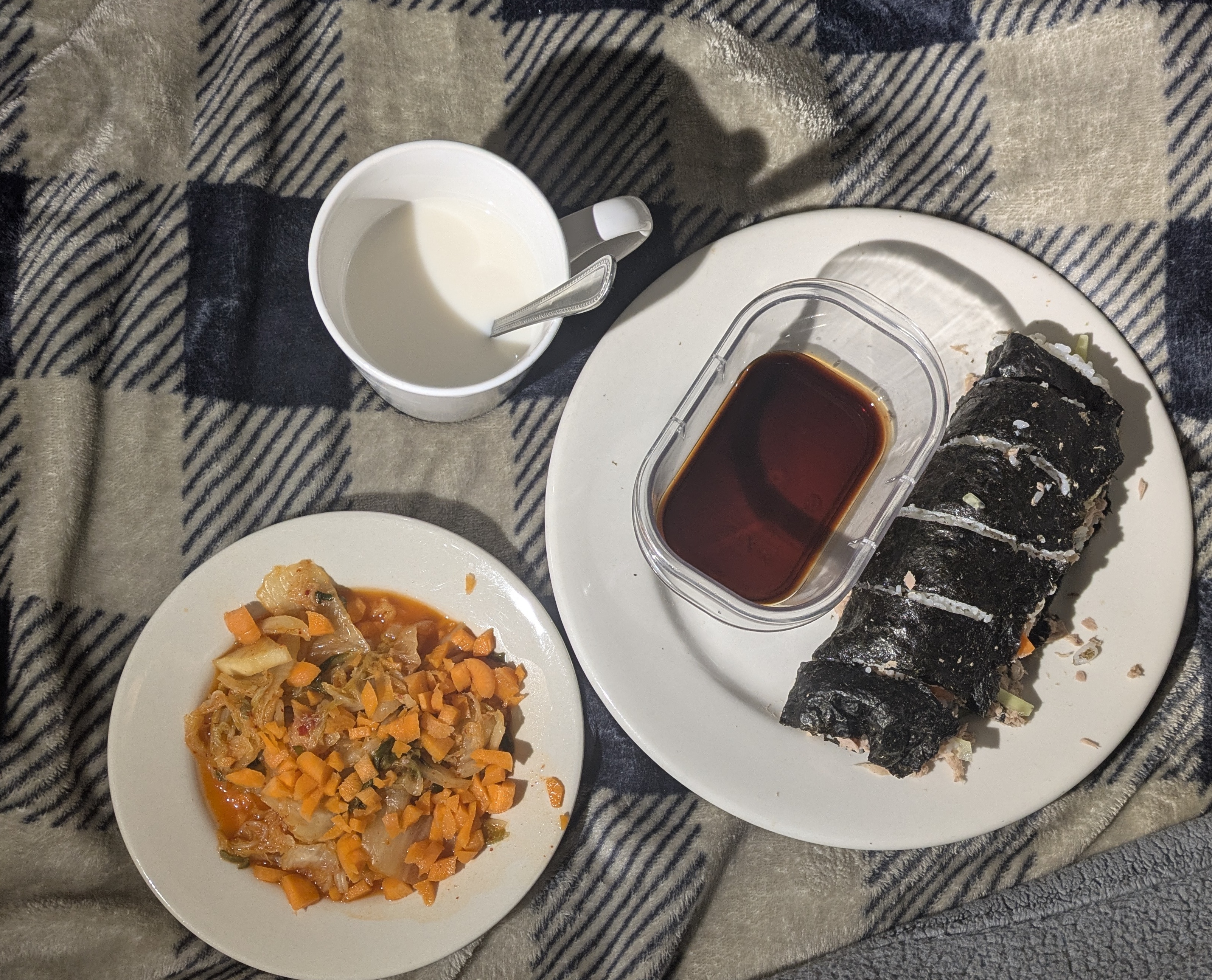Breakfast- sushi (tuna, carrot, cucumber) with kimchi and soy sauce on the side.