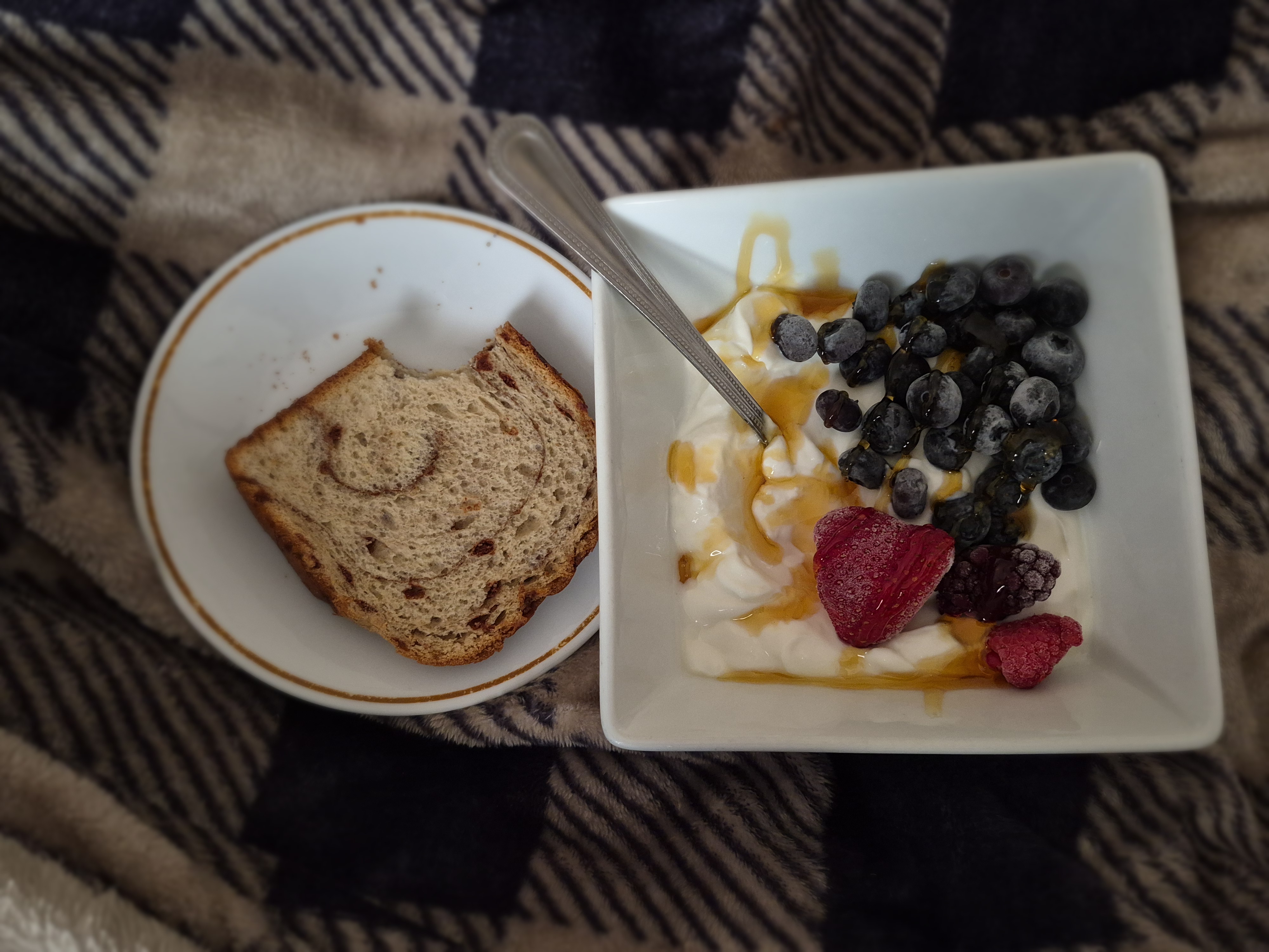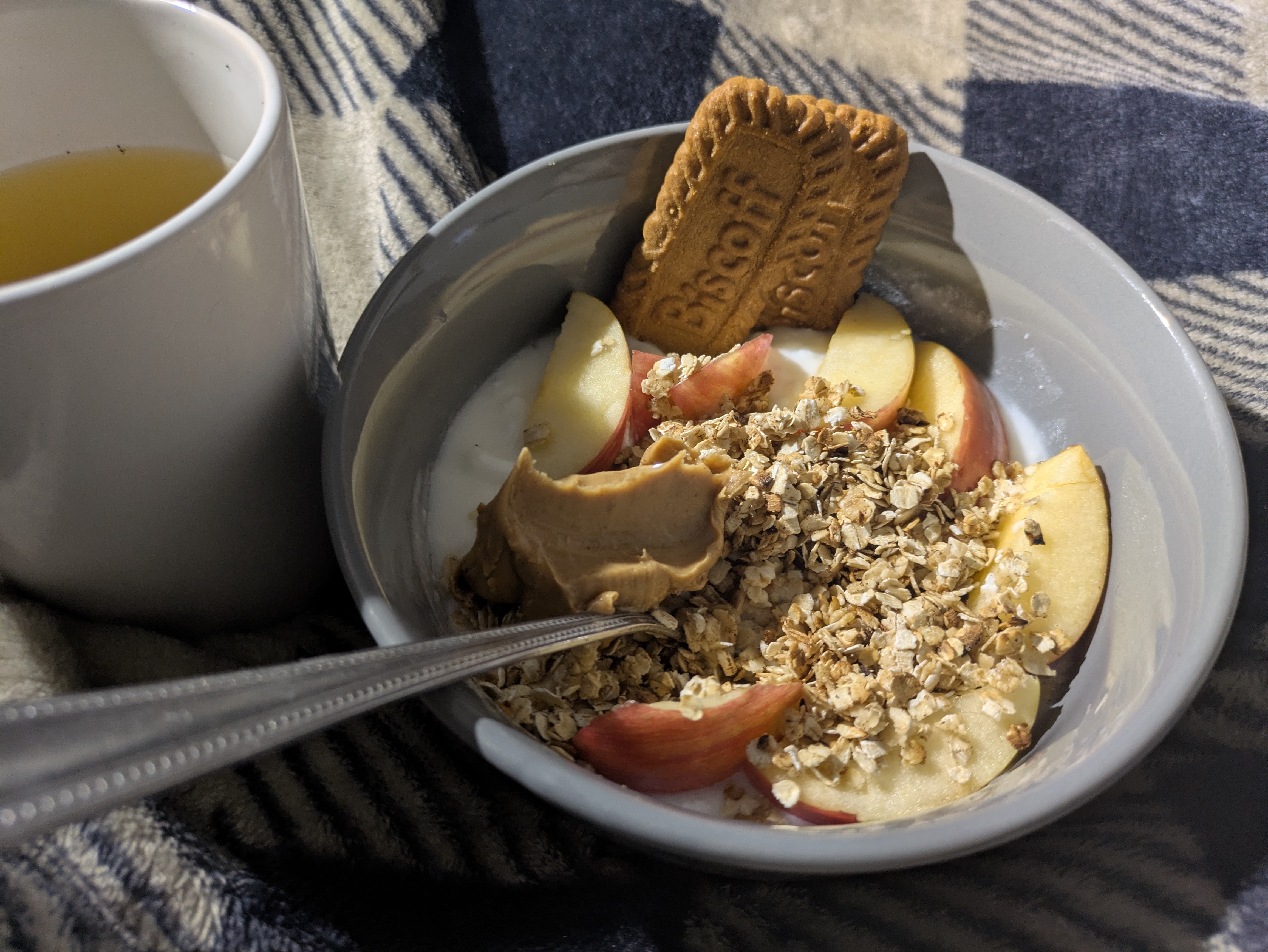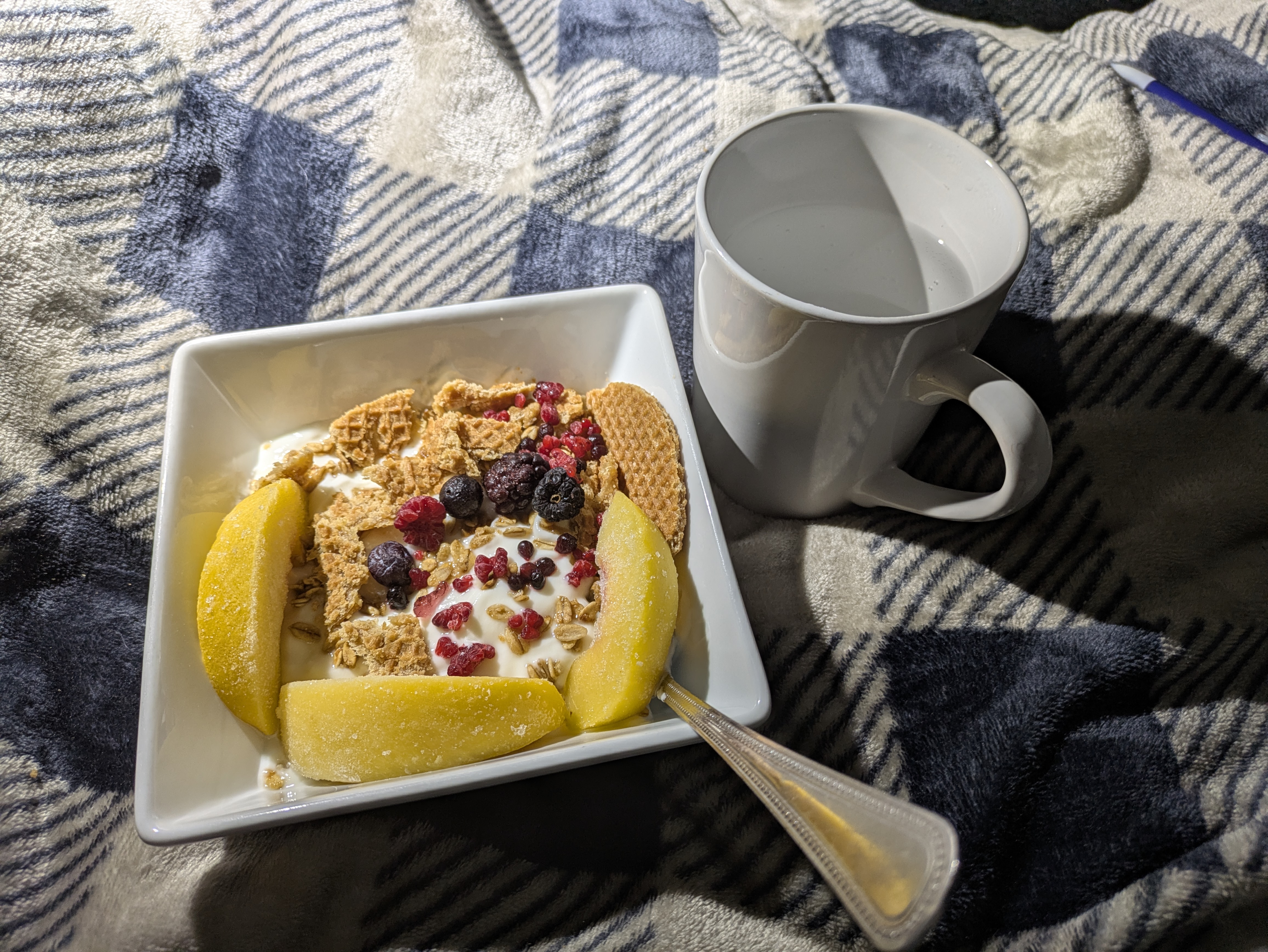 Breakfast bowl - sliced frozen peaches, yogurt, frozen mixed berries, stroopwafel.