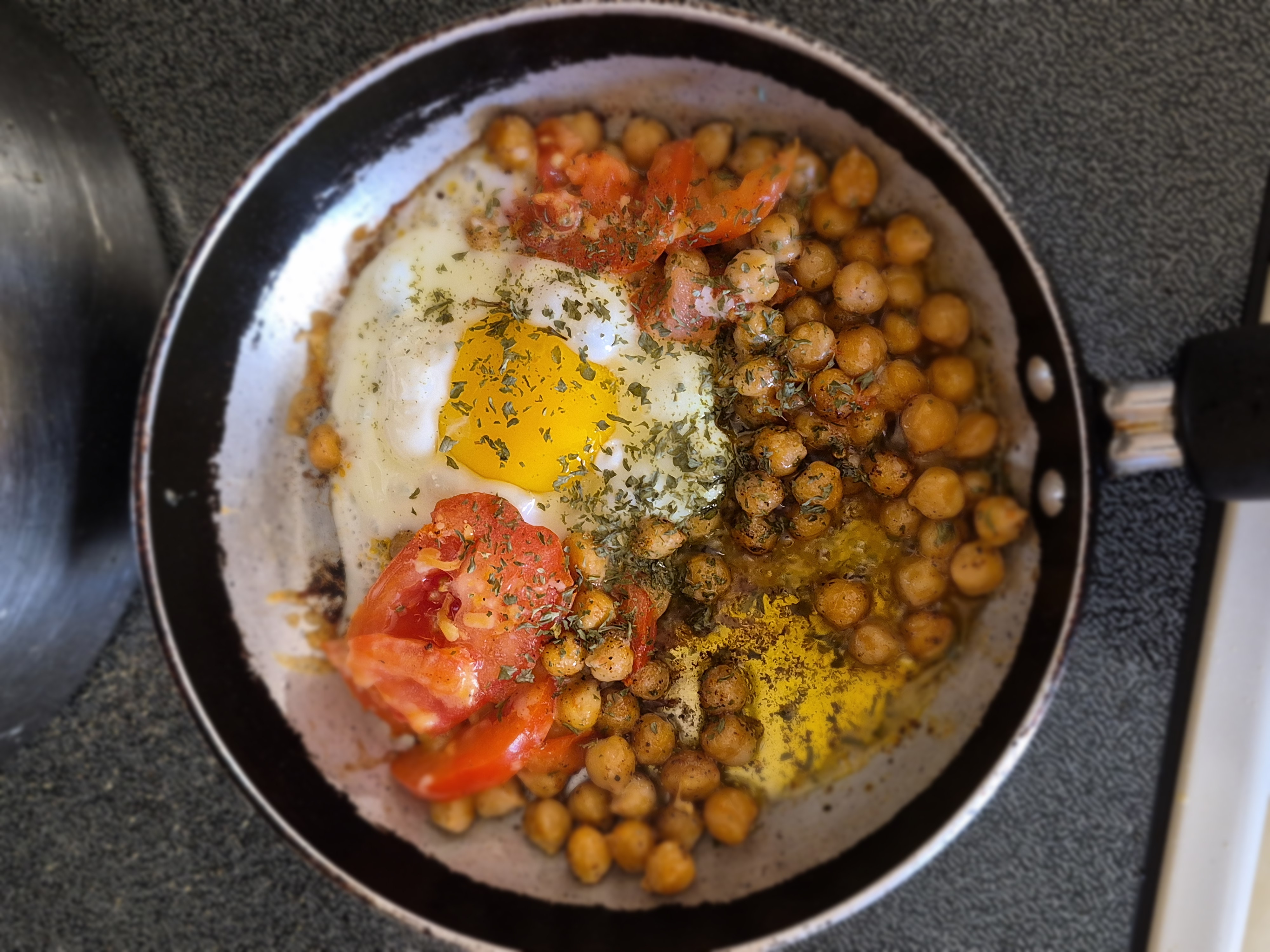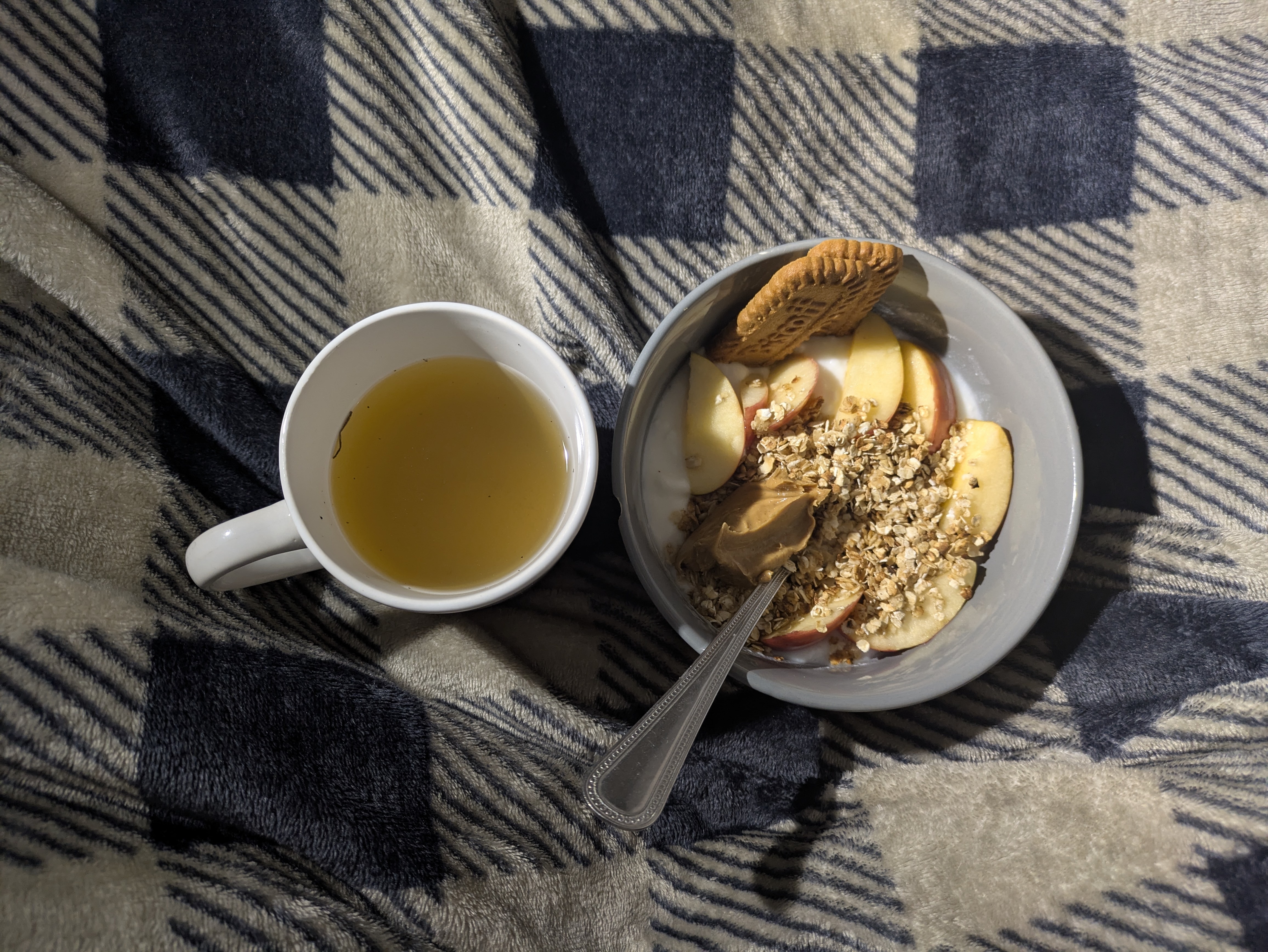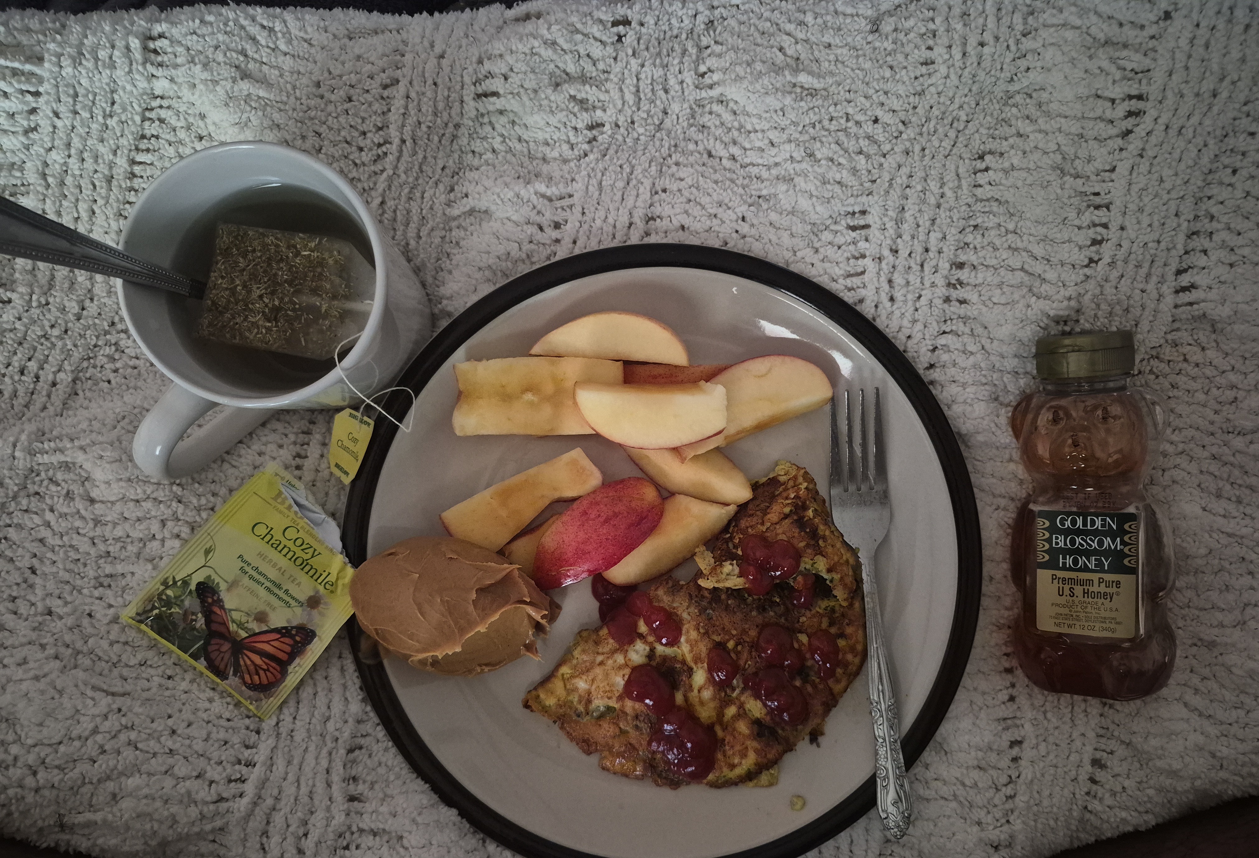 Apples, tea and egg monstrosity. Also raspberry sorbet.