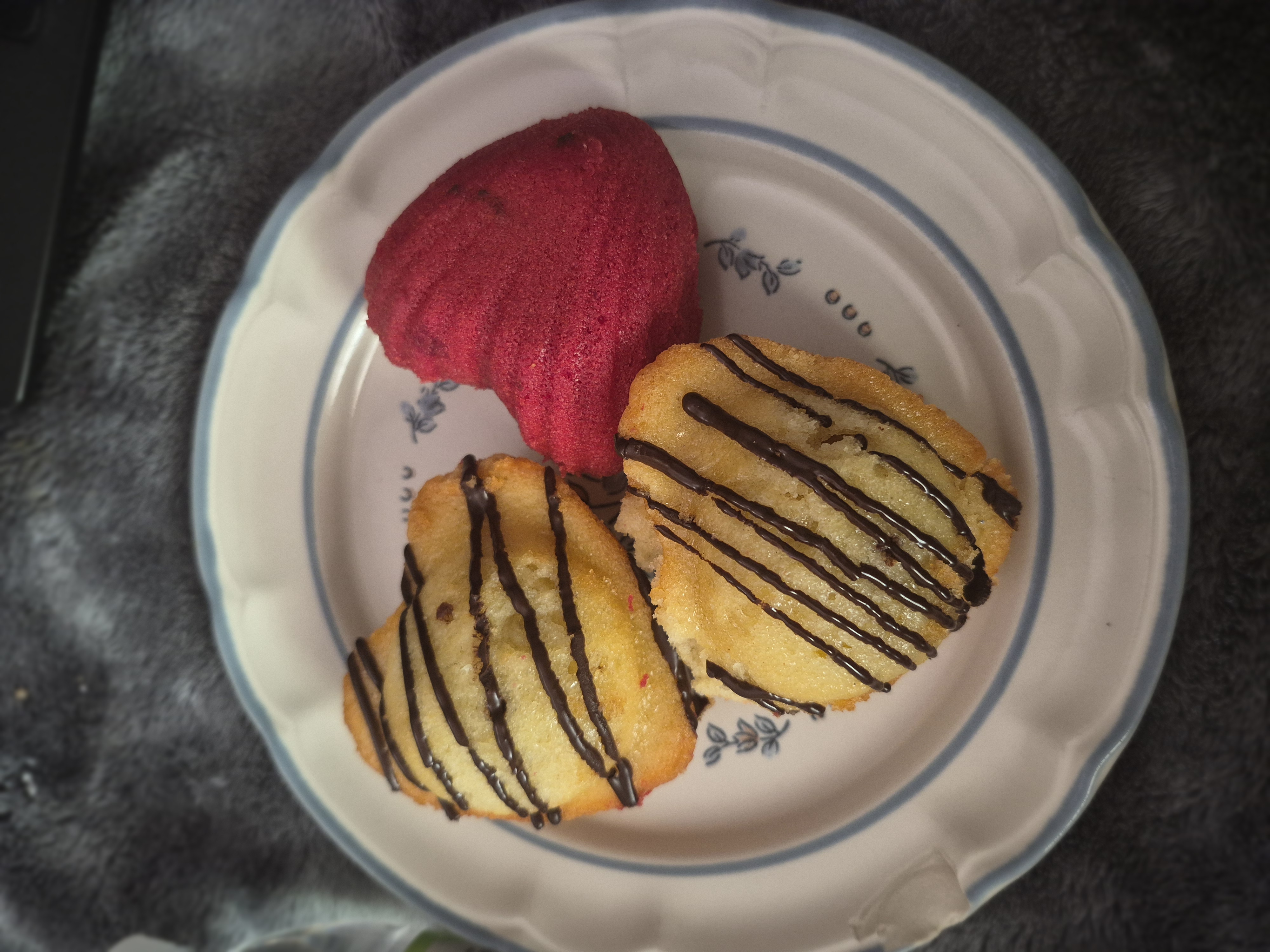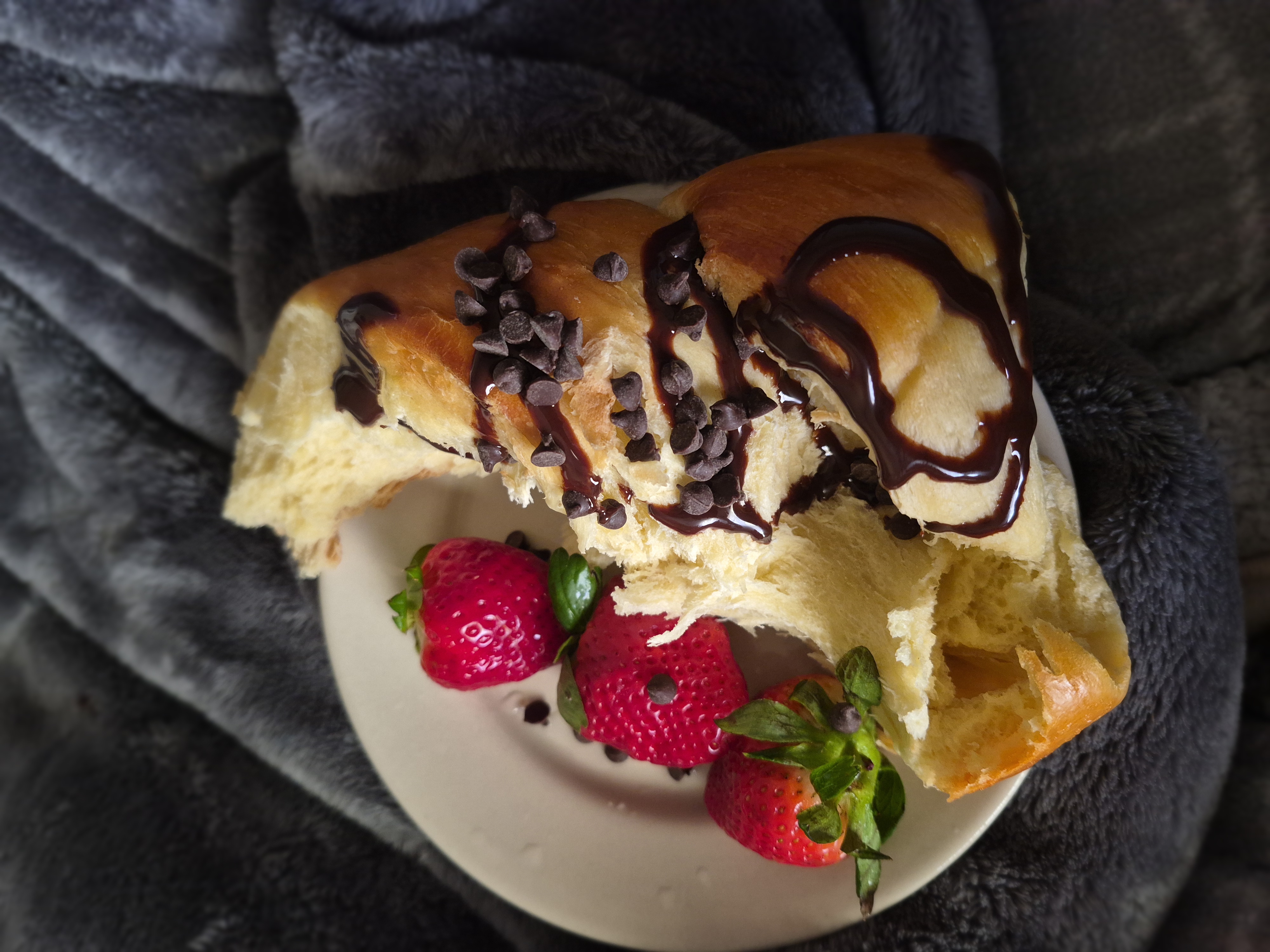 Strawberries and challah with chocolate syrup and chocolate chips, chocolate quickbread, and madeleines.